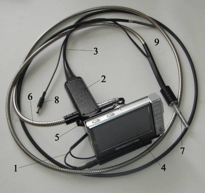 Видеоэндоскоп серии ВСР представляет собой волоконно-оптический прибор, устройство которого конструктивно показано на Рисунке 1. Он состоит из камеры, монитора, дистальной части, погружаемой части и корпуса. Погружаемая часть представляет собой гибкую оболочку, внутри которой уложен волоконно-оптический жгут для передачи светового потока, создающего необходимый уровень освещенности исследуемого объекта. Жгут подсветки выполнен неразъемным с прибором. Дистальная (подвижная) часть видеоэндоскопа может изгибаться в двух плоскостях на 180 градусов (вверх/вниз и влево/вправо). Управление дистальной частью производится вращением ручек, расположенных с правой стороны корпуса прибора. Видеорегистратор с монитором выполнен съемным.