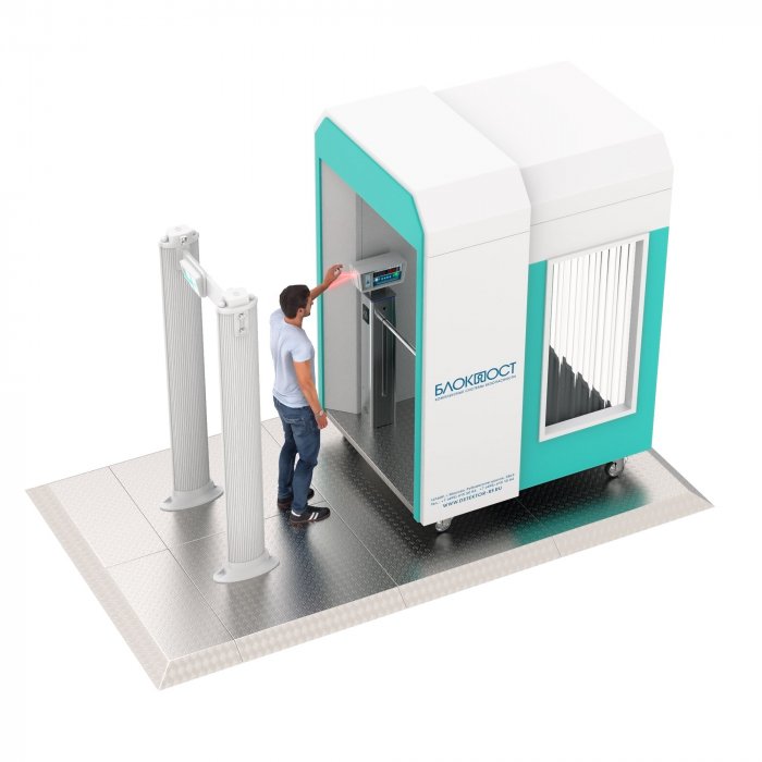 Данное готовое решение является мобильным, всепогодным комплексом досмотра и дезинфекции. Комплекс пропускного контроля быстро собирается и полностью автоматизирован. Он состоит из всепогодного арочного металлодетектора, турникета, термодатчика Блокпост РС И и кабины дезинфекции. Человек проходит обязательный досмотр на наличие запрещенных металлических предметов, выявление повышенной температуры тела, полную дезинфекцию, а также идентификацию личности системой контроля доступа (Proximity карта).