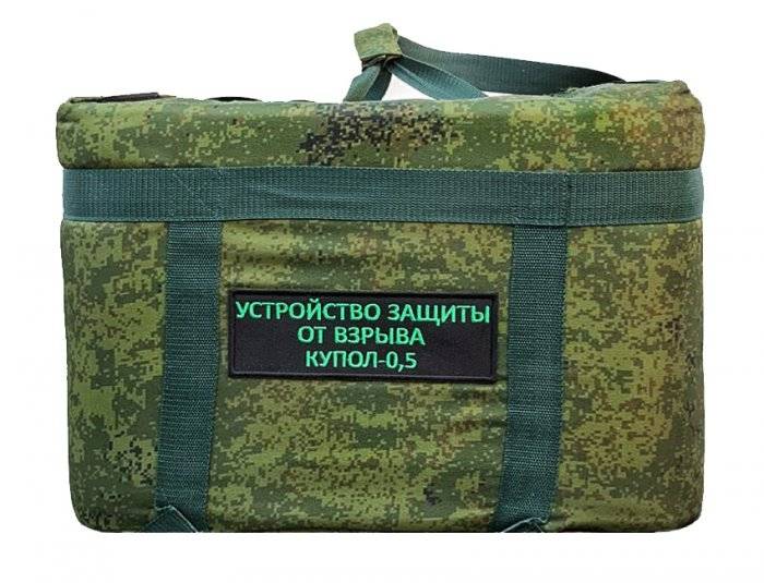 Устройство локализации взрыва КУПОЛ–0.5 изготовлено в форме контейнера, в нижней части которого предусмотрена емкость для взрывного устройства. Стенки и верх защитного оборудования содержат емкости с дисперсионным агентом – веществом, которое призвано погасить взрывную волну. Оборудование поставляется в чехле с удобными ручками.Важно, что все материалы, использованные для изготовления КУПОЛ-0.5, не дают вторичных осколков и не выделяют токсические вещества при нагревании.