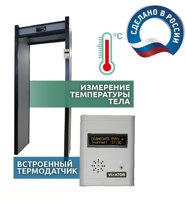 Однозонный арочный металлодетектор со встроенным термодатчиком. Расстояние измерения до 5 см. Вывод сухих-контактов (NO/NC) для СКУД непосредственно из бесконтактного термометра. Разъем для внешнего аккумулятора. Ширина прохода: 76 см.