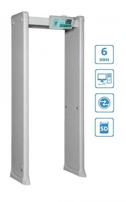 Количество зон: шесть. Наличие светодиодных индикаторов, располагающихся по боковым антенным панелям, позволяет очень быстро оценить местоположение запрещенных металлических предметов на теле человека. Подключение к ПК.