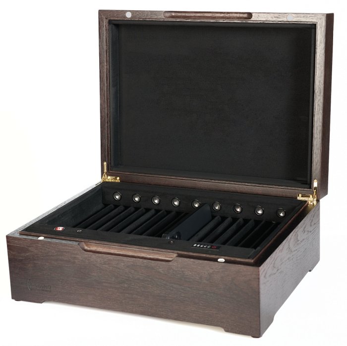 - Элегантный корпус из лакированного массива дерева с магнитной фиксацией крышки;