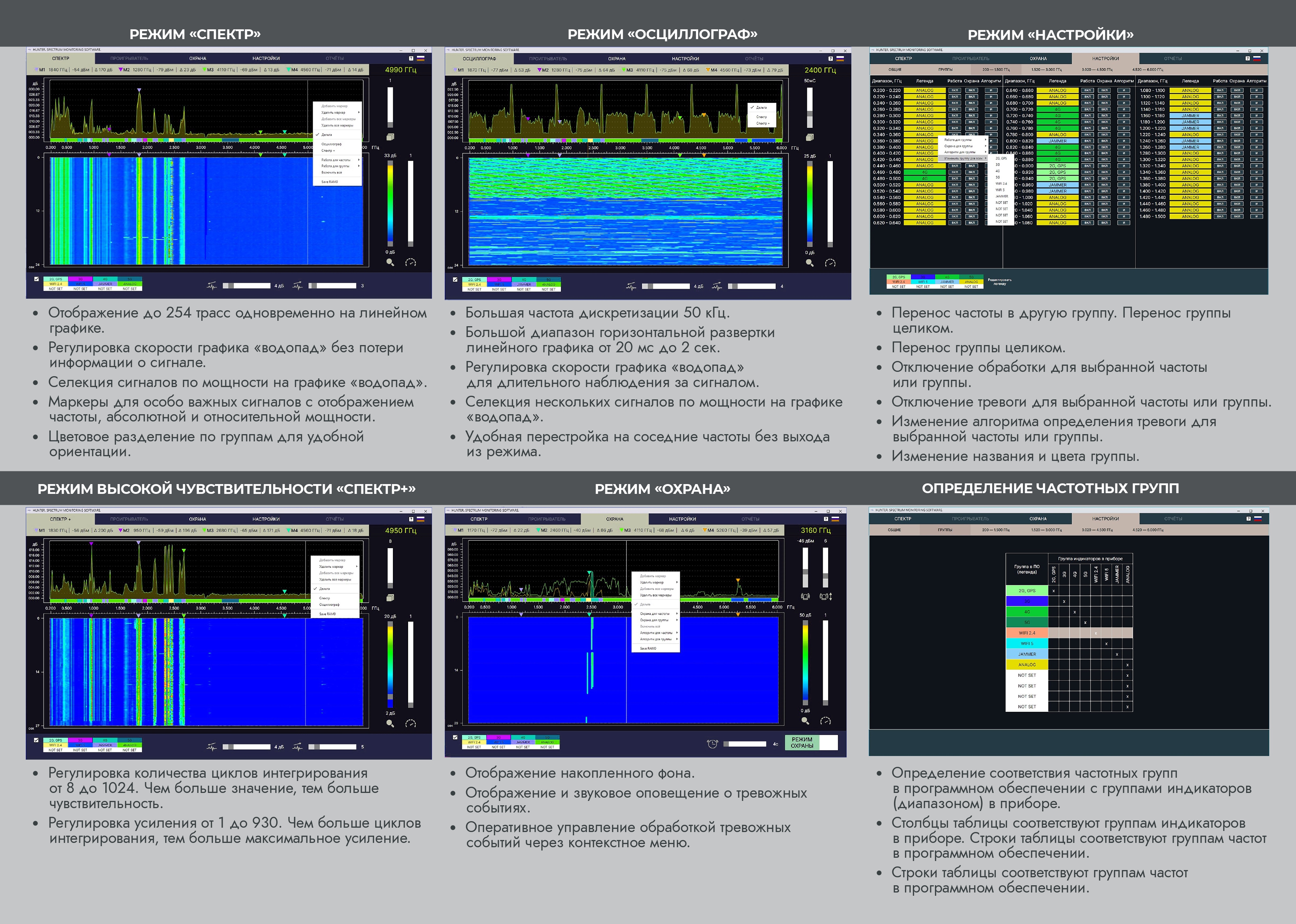 Обеспечивает поиск радиопередающих устройств и наблюдение за радиопередающими устройствами. Поиск целесообразнее проводить по линейному графику, наблюдение осуществлять по графику "водопад".Особенности работы:
